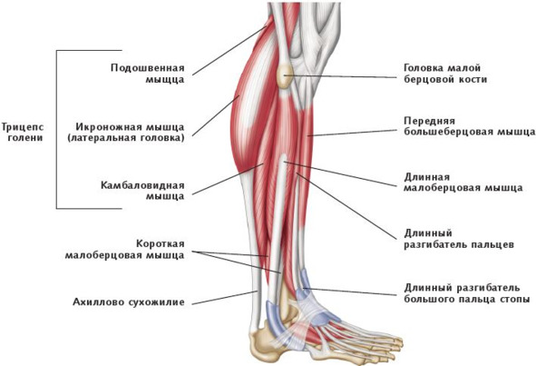 То, что мы обычно называем икроножной мышцей, есть не что иное, как мышца с тремя брюшками, то есть трицепс голени. Одно из них составляет камбаловидная мышца. Её, как правило, не видно, поэтому часто не учитывают. Сама икроножная состоит из двух головок – медиальной и латеральной. Обе двусуставные, соединяются с камбаловидной в большом общем сухожилии на уровне пятки – знаменитое ахиллово сухожилие.