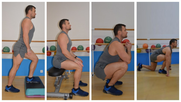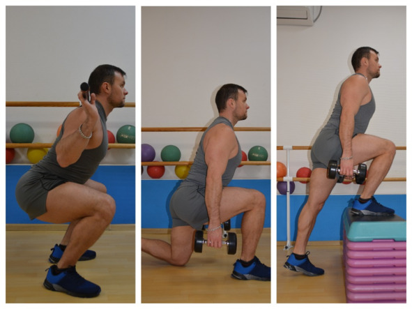 2. Возвращение из положения на корточках может быть воспроизведено с помощью выпадов или болгарского приседа (рис. 2.5). Принято понимать, что выпад – движение, при котором шагающая нога при вставании приставляется ко второй ноге, а болгарский присед (сплит-присед) – движение, при котором одна нога находится позади корпуса, либо на прочной основе, и не возвращается к другой ноге при вставании (так называемый присед «в разножке»). Упражнение требует предельной концентрации и хорошего баланса. При этом сокращение ягодичной мышцы (разгибательной) одной стороны всегда связано с расслаблением подвздошно-поясничной (сгибательной) мышцы, обеспечивая тем самым выполнение шага. Кроме того, разгибание бедра при опоре стопы на землю происходит с повышенной начальной нагрузкой, когда приходится поднимать тело только одной конечностью за раз.