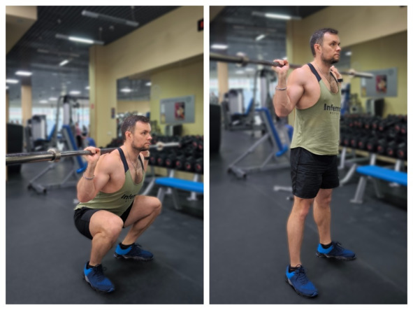 1. Вставание со штангой (или с любым другим отягощением), то есть тот самый присед, представляет собой естественное движение с хорошей начальной нагрузкой, состоящей из веса тела и дополнительного отягощения (рис. 2.4). Разгибание тазобедренного сустава выполняется в замкнутой кинетической цепи, при этом стопы надёжно закреплены на земле, и ягодицы стимулируются в соответствии с природной жизнедеятельностью.