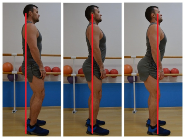 Рисунок 2.7. Изменение постурального выравнивая при наклоне назад (слева), при нормальном лордозе (в центре) и гиперлордозе (справа)