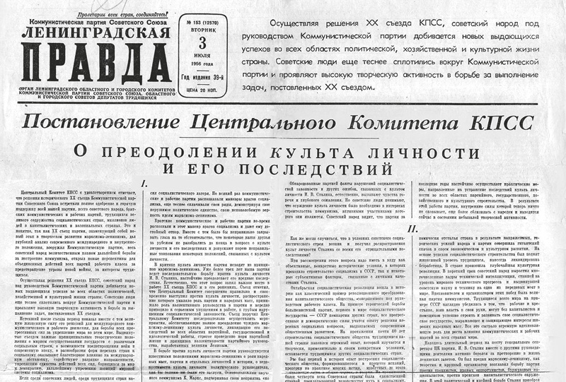 …Воздавая должное заслугам И. В. Сталина, трезво оценивая тот крупный вклад, который был им внесен в дело революции, в дело строительства социализма, партия в то же время решительно поставила вопрос о ликвидации культа личности Сталина для того, чтобы полностью восстановить ленинские принципы и нормы партийной и государственной работы и создать тем самым наилучшие условия для нашей великой созидательной деятельности по строительству коммунизма» (Правда, 28.III. 1956, № 88).