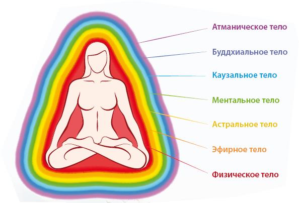 Обычно аура распространяется на расстояние 10–15 см от физического тела и состоит из ряда энергетических слоев, которые называются энергетическими телами, или «тонкими телами».