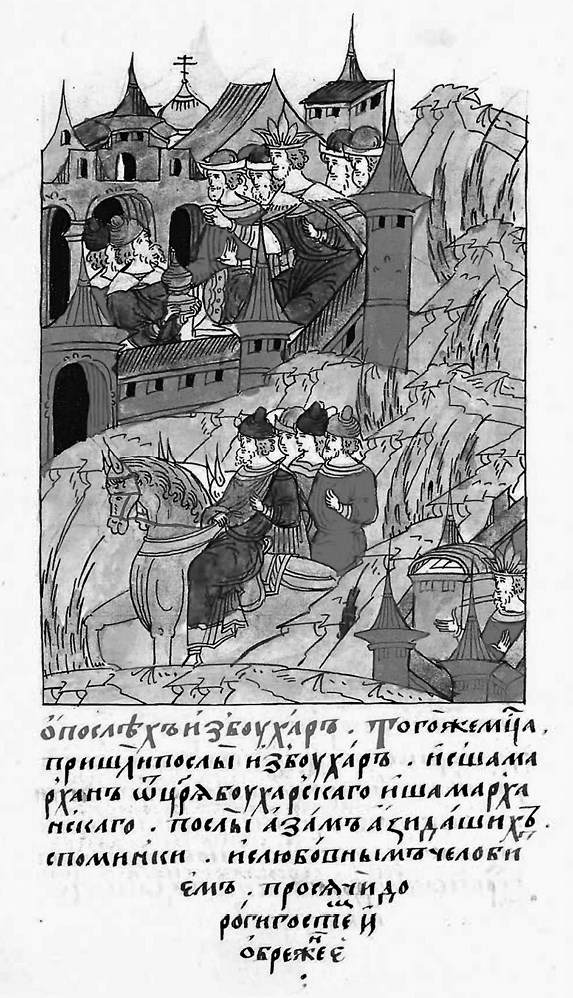 Ил. 1. Бухарское посольство к Ивану IV, осень 1558 года. Источник: Лицевой летописный свод. Кн. 23. С. 98. Любезно предоставлено Коллекцией Джека Коллмана с разрешения издательства «АКТЕОН»