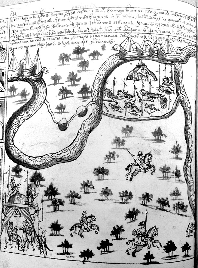 Ил. 2. Изображение из Ремезовской летописи, показывающее место, где Ермак и его люди встали лагерем, не найдя бухарский караван, которому Кучум, по их сведениям, не позволял пройти в сибирские города торговать. Ермак погиб ночью, попав в засаду. Источник: Дергачева-Скоп Е., Алексеев В. Служебная чертежная книга. Семен Ремезов и сыновья. Текст рукописи Российской национальной библиотеки (Санкт-Петербург), комментарии / Ред. В. М. Гуминский. Тобольск: Изд‐во ОФ «Возрождение Тобольска», 2006. Изображение № 98. Любезно предоставлено издательством «Возрождение Тобольска»