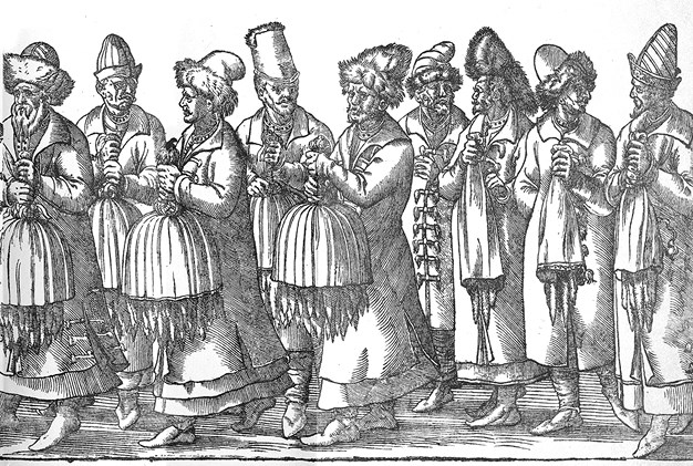 Ил. 3. Русское посольство Ивана IV к императору Священной Римской империи в Регенсбурге в 1576 году. Гравюра изготовлена в типографии Михаэля Петерле, очевидца посольства. Вторая часть четырехчастной гравюры, изображающей процессию послов, показывает свиту: людей, несущих пушнину. Сами послы показаны в первой части (Wikimedia)