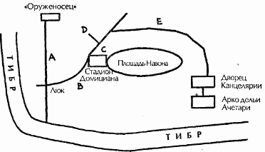 Атто в общих чертах изобразил то, что нам было известно. В первую ночь мы покинули «Оруженосец» и добрались до Тибра по галерее, указанной на плане буквой А. В своде этой галереи мы впоследствии обнаружили люк, через который проникли в другую галерею, ведущую к развалинам стадиона Домициана, расположенным под площадью Навона. Эта галерея была обозначена буквой В. Через узкий проход от площади Навона можно было попасть в галерею С, а из нее в галерею Е, изображенную в виде кривой линии, – по ней мы преследовали Стилоне Приазо и оказались в подземных залах с расписанными фресками стенами под дворцом Канцелярии. Мы тогда еще добрались до Арко дельи Ачетари. И наконец, небольшое ответвление влево D, берущее начало от галереи С.