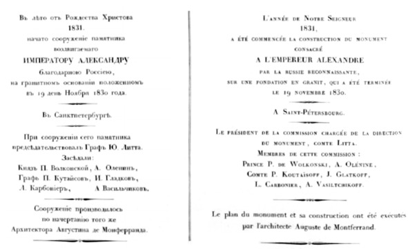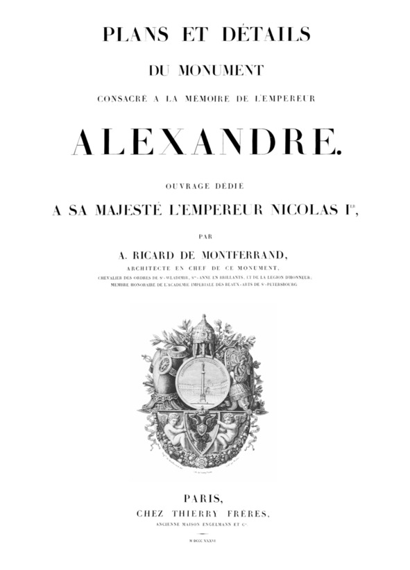 Трактат «Планы и детали монумента, посвященного памяти Императора Александра» был издан в 1836 году архитектором О. Монферраном на французском языке – Montferrand, A. Ricard de. Plans et détails du monument consacré a la mémoire de l’Empereur Alexandre: Ouvrage… A. Ricard de Montferrand…: [Album]. – Paris: Thierry Fr.: 1836. – 40 p.