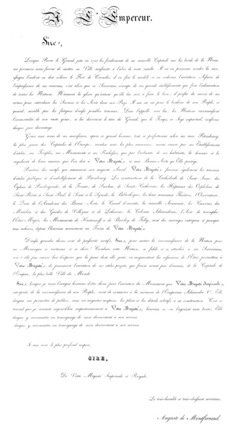 Когда Рим триумфально привез из Александрии свои галеры, нагруженные очень большими обелисками Египта, и поместил их на площадях, Рим доказал миру, что нет ничего невозможного для человека, если он движим твердой волей и чувством собственного величия. Легко понять, что, проникнувшись схожими идеями некоторых предшественников, я осмелился начать создание монумента памяти императора Александра Ι.
