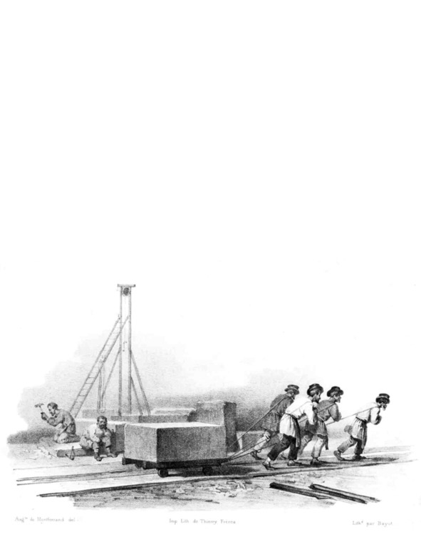 Мы начали с верхней части скалы, избавившись от испещрённой бороздами корки, которая ее деформировала, чтобы убедиться, что ни одна трещина не сможет нанести ущерб однородности массы. По окончанию первых приготовлений мы продолжили работы, сделав переднюю часть скалы достаточно ровной, одинаковой высоты, той, которая нам требовалась. Другие части, подлежащие добыче; у других частей мы срезали торцы; в результате этого с 2-х сторон глыбы мы получили многочисленные отверстия, почти соединяющиеся между собой. В то время как одна часть рабочих стесывала торец камня, другая делала выемки в нижней части для подготовки его падения.