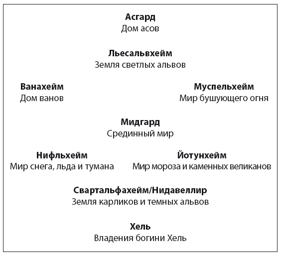 Иггдрасиль, великий Мировой ясень, стоит в центре Вселенной, связывая все девять миров. Верхние миры таковы: на самом верху находится Асгард, дом высших богов – асов; Льесальвхейм, дом светлых альвов, и Ванахейм, дом богов плодородия – ванов. В центре стоит Мидгард, срединный мир, «людей прекрасное жилище», его соединяет с Асгардом Биврест, радужный мост. На севере лежит Нифльхейм, страна вечного снега и льда; на юге – страна бушующего огня.