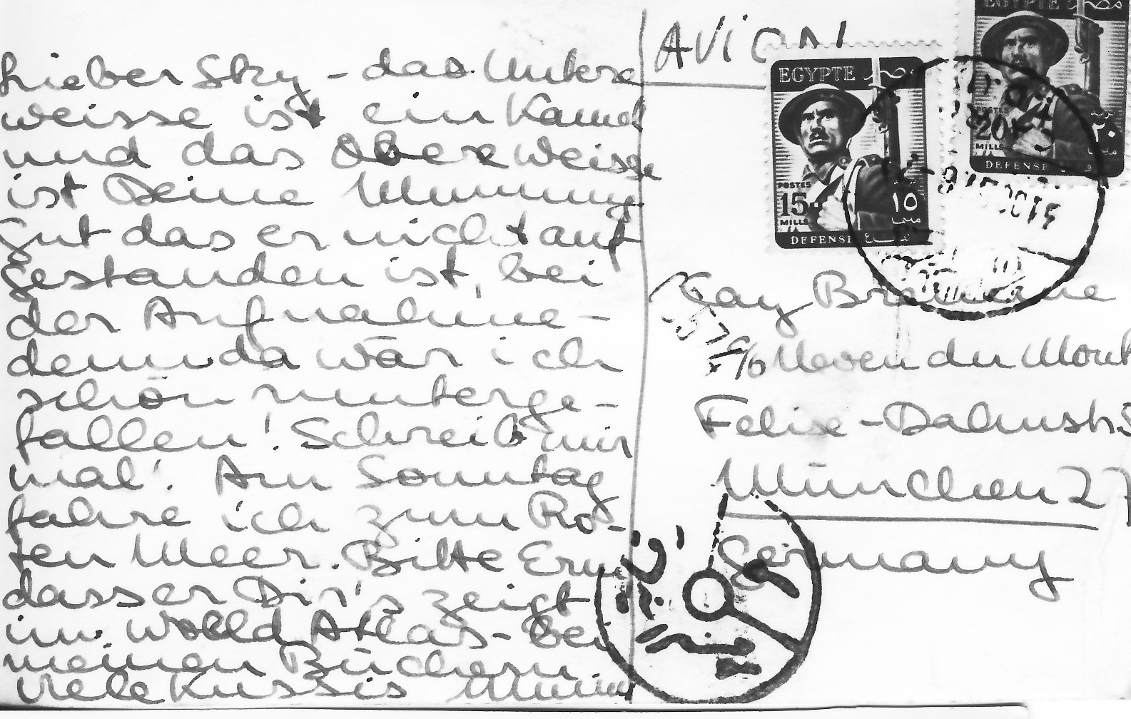 "Dear Sky, The white thing below is a camel, the white thing above is your Mummy. Good that the camel didn't get up during the photo, or I would have fallen off. Write to me. On Sunday, I'm going to the Red Sea. Ask Erni to show it to you in the World Atlas. Lots of kisses, Mummy."