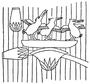 Существовало несколько вариантов использования папируса. Нижний край стебля жевали (это роднит его с современным тростниковым сахаром). Остальные части растения применяли для изготовления коробов, корзин, клеток и легких лодок. Корзина, в которую положили младенца Моисея, была сплетена из папируса. Однако важнее всего было то, что из него можно было делать «бумагу», пригодную как для письма, так и для рисования и хранившуюся на протяжении неопределенно длительного срока. Север Египта был покрыт густыми зарослями папируса. В развесистых соцветиях этого растения, высота стеблей которого в пять или шесть раз превышала человеческий рост, гнездились зимородки и другие речные птицы, опасавшиеся, что на них в любой момент могут напасть виверры, крысы или дикие кошки (рис. 6). В корнях папируса друг за другом гонялись и ловили друг друга рыбы, выдры, гиппопотамы и крокодилы.