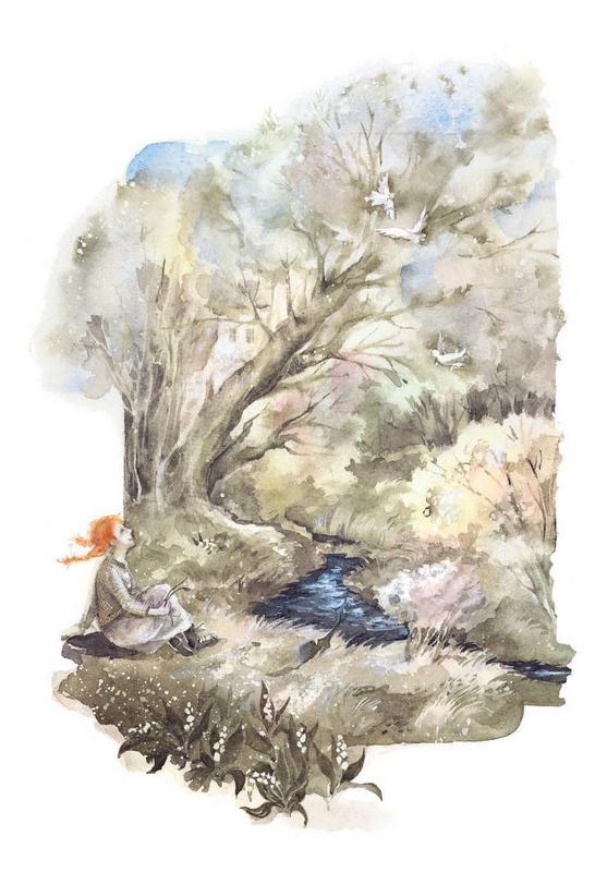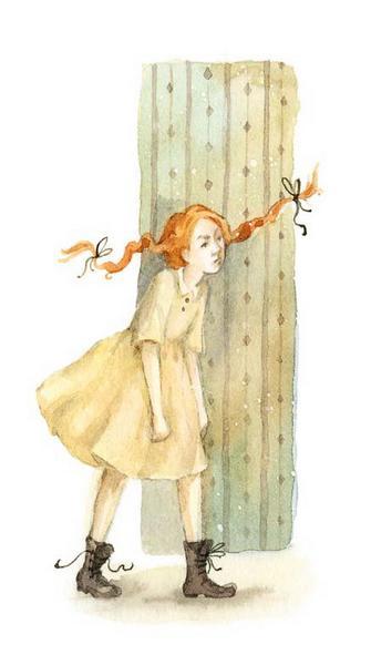 Аня сидела на стуле у окна, печально глядя в сад. Она казалась такой маленькой и несчастной, что у Мэтью дрогнуло сердце. Он бесшумно прикрыл за собой дверь и на цыпочках подошел к ней.