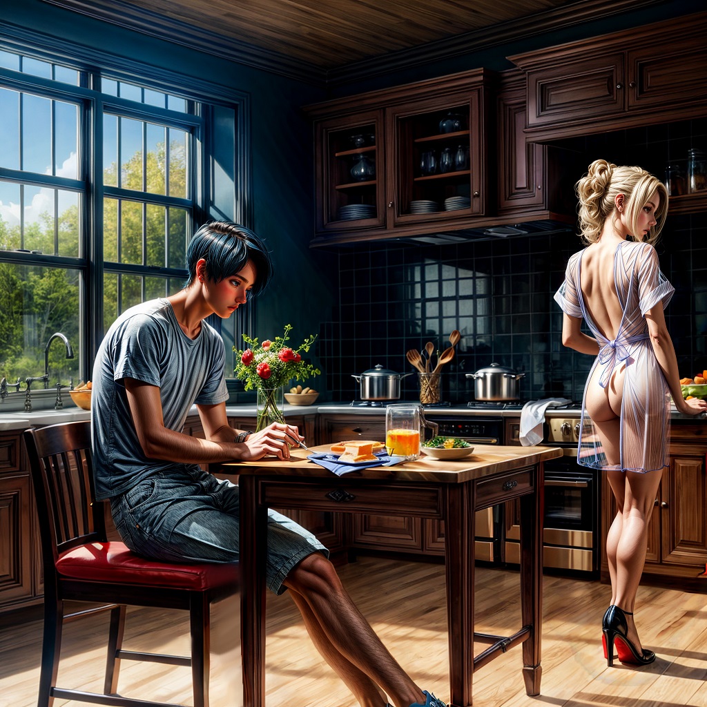 Элеонора, одетая в какое-то странное, но красивое платье с обтягивающим верхом и полупрозрачной, собранной из нескольких слоев воздушной короткой юбкой, что-то стряпала за печкой и тихонько мурлыкала себе под нос. Пела? Первый раз видел её за плитой. Вообще, не думал, что она что-то готовит или даже умеет. Как я заметил, еду нам доставляли на дом из ресторанов или из магазинов, не нужно даже никуда ходить.