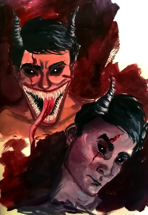 Из каких-то невидимых и не ощущаемых Степанидой глубин, повалил красный дым, откуда-то снизу, раздался резкий грохот и скрежет тяжело открывающейся трëхметровой двери. У Степаны, побежали мурашки, и будь на теле волосы, то они точно встали бы дыбом, не считая головы, конечно, там то волосы есть, но они длинные, а посему визуально увеличился лишь объëм, так как такой длины локоны, не способны полностью поднять самих себя. Резкий звук, словно что-то рассекает ветер, не успел оповестить девушку о том, что сзади неë, из ниоткуда появилось чудище, не имеющее облика, будто сгусток тени, что имеет только форму, волнующий своим появлением пламя свечей и факела Тень, разлилась по полу, и из неё, поднимаясь словно на лифте, показалось существо, отличное внешним видом от человека, но имеющее тот же силуэт. Внешне, хозяин подземелья, похож на дьявола, наверно поэтому, ходят байки по городу о жертвоприношениях. Кожа, багрового цвета, близкого к коричневому, чёрные как смоль глаза, зубы как у акулы, растущие в два ряда, мускулистое тело, здоровые руки с когтями. Ростом примерно два с половиной метра, это существо, внушает всем своим видом лишь страх.