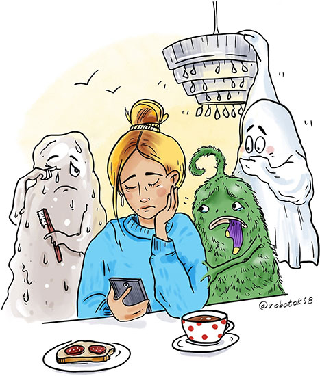 * * *Все последующие дни ни пропадающие носки, ни хлюпанье в унитазе, ни мокрые следы по всей квартире, ни пятна, появляющиеся в самых неожиданных местах, не могли выкурить настырное семейство из облюбованной монстрами квартиры. Только мама стала больше уставать, особенно в будние дни.