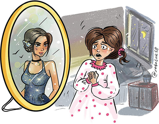 Люда замерла. Не шевелясь, лежала под одеялом. Ее глаза уже привыкли к темноте, и она различала отдельные предметы. Она ясно слышала, как дверь в комнату отворилась, и по направлению к зеркалу скользнула темная тень. Люда с отчаянной решимостью включила ночник и направилась к зеркалу. Отражение было на месте. Волосы его были растрепаны, глаза лихорадочно блестели. Но самое странное, что вместо обычной ночнушки в горошек, которая надета на Люде, на девушке в отражении было Людино вечернее платье с блестками.