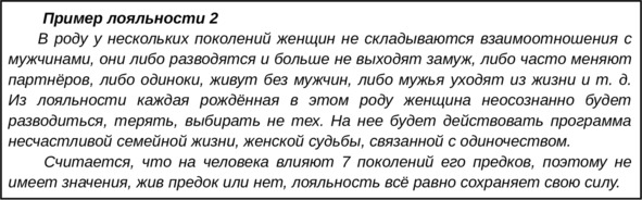 Внутри каждого человека заложена информация о его роде, его семье, обо всех событиях, произошедших в прошлом. Все семейные ценности, убеждения, правила, объединяющие людей в семейные системы, находятся в бессознательном всех членов семьи. Некоторые правила и ценности нами осознаются, некоторые нет. Каждый человек обладает лояльностью к своей семье, к своему роду.