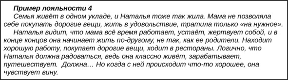 Лояльность – это неосознаваемая человеком верность порядкам и устоям, поступкам и проступкам, правилам и запретам, существующим в семейной системе. В основе лояльности, с одной стороны, лежит любовь к членам своей семьи, с другой – страх потерять принадлежность к своей семье, то есть быть ею отвергнутым. Из лояльности каждый человек считает убеждения, правила и порядки своей семьи верными и правильными.