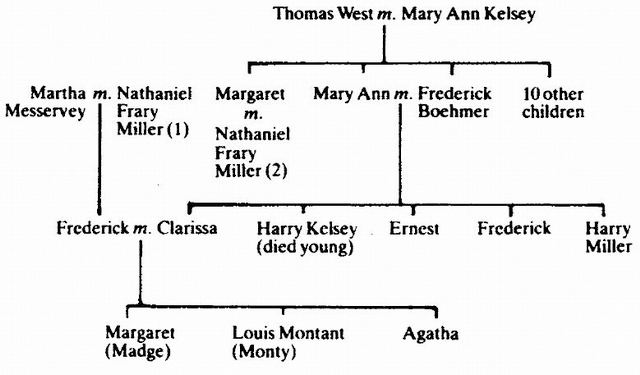 Meanwhile, Mary Ann’s elder sister, Margaret, had been working in a large hotel in Portsmouth, a post found by an aunt who had for many years been its forceful and greatly respected receptionist. Margaret, already formidable herself, married when she was twenty-six, in April 1863. Her husband, Nathaniel Frary Miller, a widower, had been born in Easthampton, Massachusetts, and had become a successful businessman, a partner in the firm of H.B. Chaflin in New York City. Nathaniel and his first wife, a hospital nurse, had only one child, a son, Frederick Alvah Miller. After his mother’s death, Frederick was brought up mostly by his grandparents in America, but, after his father remarried and settled in England, where his firm had business in Manchester, Frederick visited Nathaniel and Margaret there. Here he met Clara.