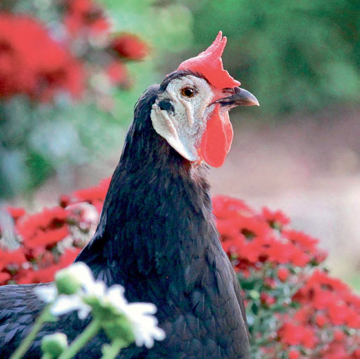 Opposite: Margarita, a Black White Faced Spanish hen.