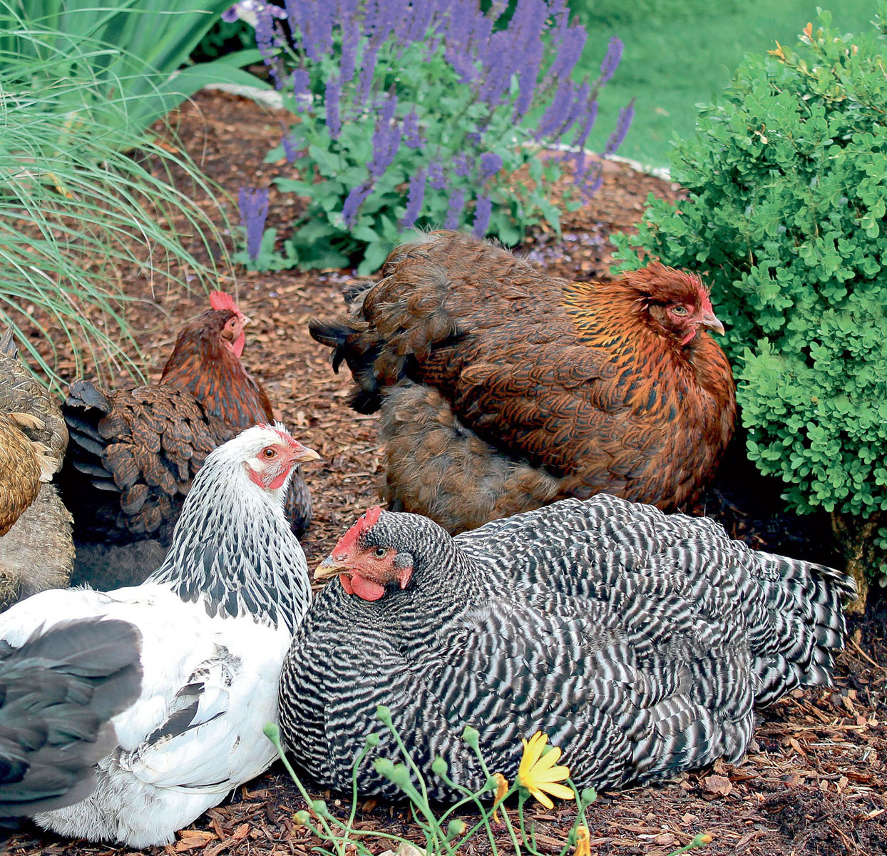 Die Aufzucht von Hühnern ist ein faszinierendes und lohnenswertes Hobby, aber es gilt zahlreiche Faktoren zu berücksichtigen, bevor man sich in das Abenteuer Hühnerhaltung stürzt. Die Hennen in der vorderen Reihe sind eine Kolumbianische Wyandotte und eine gebänderte Plymouth Rock. Die Hennen im Hintergrund sind von links nach rechts eine Schwarzkupfer-Weizen-Maran, eine Partridge Plymouth Rock und eine Partridge Cochin.