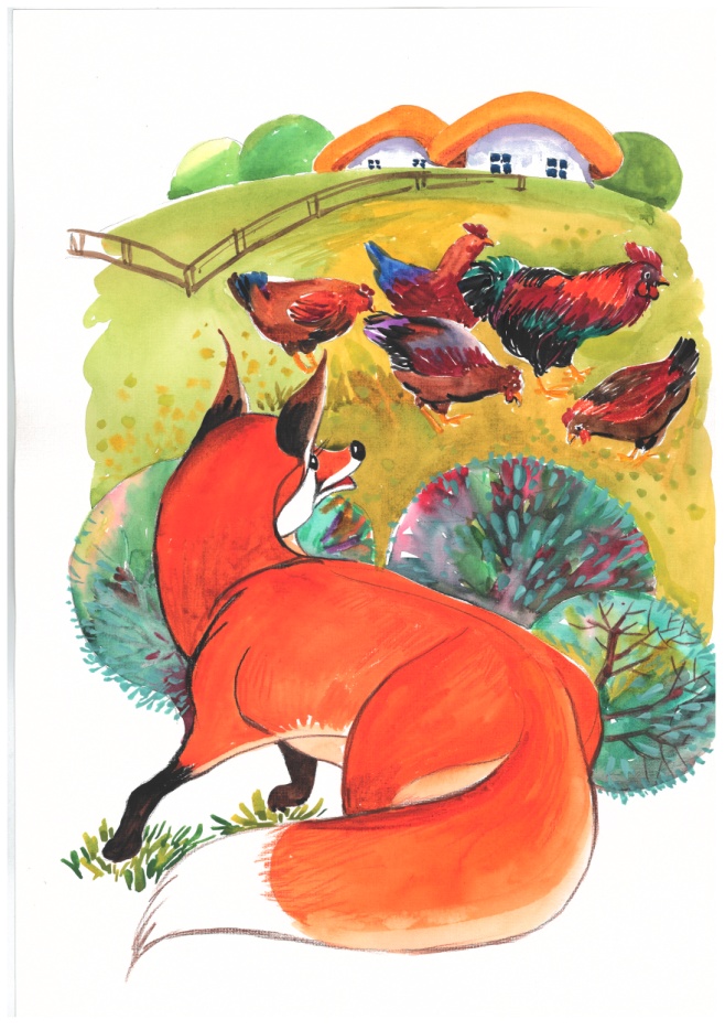 Решила лиса Василиса днём не ложиться спать, а на охоту идти. И, когда кур на полянку выпустят, прихватить одну к ужину. Пришла заранее, притаилась в пролеске, стала наблюдать. Смотрит – куры ходят, в земле зернышки ищут да червячков разных. По сторонам не глядят. И петух с ними. Красивый, с разноцветными перьями. С умным видом, по-хозяйски следит за всеми, не даёт курам разбредаться в разные стороны. Зовёт их то к одной вырытой ямке, то к другой. Решила лиса время выждать, когда внимание петуха ослабеет. Но уснула незаметно – сморило на жаре. Не привыкла лиса днём охотиться.