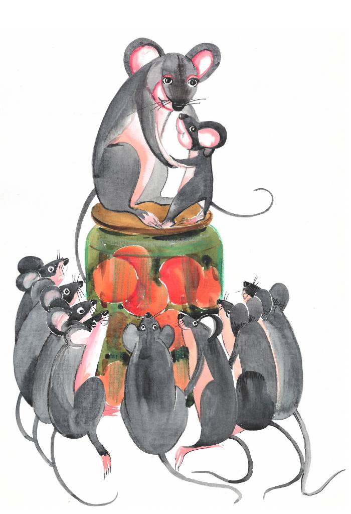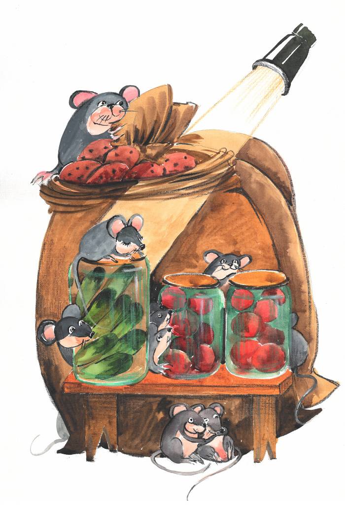 И вот однажды раздался страшный грохот и лязг. Мыши бросились врассыпную, Петя замешкался и не успел убежать. В одну секунду стало так светло в подполе, что Петя невольно зажмурился. А сидел он в это время на крышке трёхлитровой банки с огурцами.