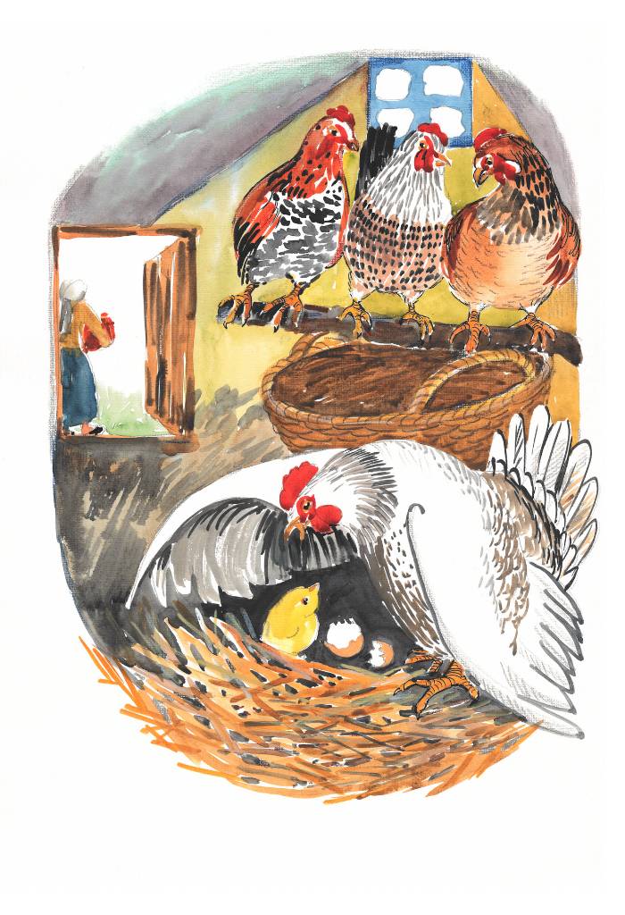 Хозяйка, тяжело дыша от такого волнения, присела на скамеечку. Куры, кудахтая, принялись обсуждать происшествие, хвалить Пикколо. Тут хозяйка и заметила жёлтого цыпленка с редкими белыми пёрышками. Она помогла Пикколо освободить застрявшую лапу. Рассмотрела его внимательно, погладила пальцем по головке, поцокала одобрительно языком и отпустила к курам.