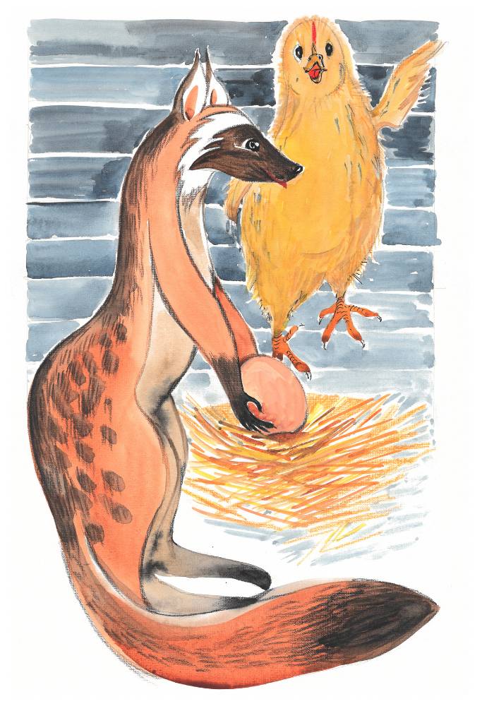 В один из июньских дней Пикколо услышал странный шорох. Вскоре показался и гость. Это была ласка. Мелькнула рыже-коричневая шкурка с белым брюшком. Ласка встала бесшумно на задние лапки посреди курятника и внимательно осмотрелась. Её чёрный нос обнюхивал воздух, а уши прислушивались к шуму двора. Заметив белое крупное яйцо, ласка метнулась к нему. Разбив скорлупу, мгновенно съела. Тут же бросилась к другому. Ласка торопилась. «Воровка!» – понял Пикколо и решил немедленно прогнать ласку. Выпрыгнул неожиданно из гнезда и запищал угрожающим голосом. Но подросшая лапа зацепилась за доску и Пикколо повалился набок, беспомощно махая крыльями. Тут же увидел перед собой крошечные, злые глазки и белые мелкие зубы, готовые укусить. Но в эту секунду влетевший петух клюнул ласку что есть мочи в голову. Вбежавшие куры подняли страшный шум, бросились на воровку. На такой переполох явилась хозяйка, опираясь на трость. В руке у неё был зажат камень. Она кинула им в воровку, но поздно – хвост ласки мелькнул между досок в полу и исчез.