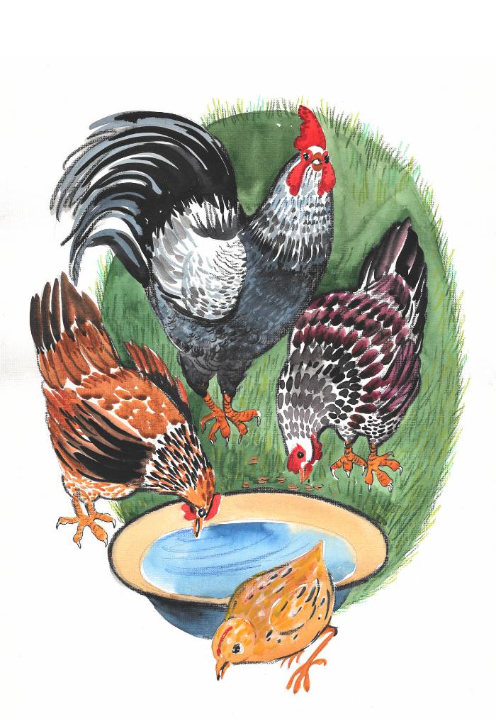 Куры тут же торжественно вывели Пикколо во двор. Солнце ослепило непривыкшие к свету глаза цыплёнка, прогрело мягкий пушок на спинке. Горячая земля жгла лапки. «Не забирайся в густую траву, застрянешь, – учила мама. – Разгребай землю аккуратно в поисках червячков, не торопись, а то вместо зёрнышка камешком подавишься!» Пикколо кивал, подпрыгивая от радости и бегая туда-сюда. Курочки наперебой звали цыплёнка, угощая найденными хлебными крошками и семечками. Потом подвели к корыту с водой. Но цыпленок был мал и никак не допрыгивал, чтобы водички напиться. Тогда петух подсадил его и Пикколо плюхнулся в корыто. Как запищал с испугу! Он ни разу в жизни не купался. Но вскоре ему понравилось. С тех пор Пикколо не приходилось больше прятаться.