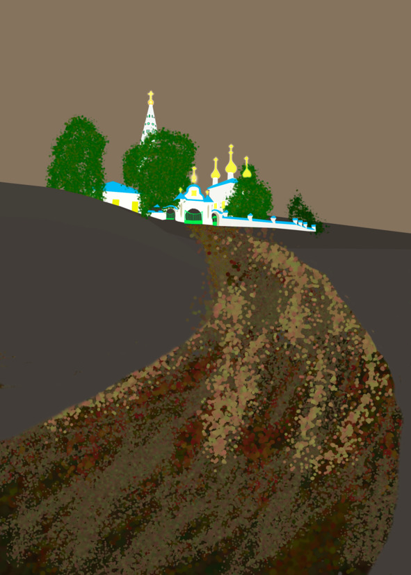 Владимир поднимался на Соборную гору. Дорога была ему хорошо знакома, но что-то было не так. Остановившись, он посмотрел вверх. В чернеющем небе вместо привычной луны нависал гигантский красный шар, с которого всепроникающим оком смотрело невидимое и неведомое доселе злобное существо. Оглядевшись вокруг, Владимир заметил, что каким-то невероятным образом исчезли все находившиеся тут прежде здания, машины и люди. Не было ничего. Оставалась только одна дорога, по которой надо было идти дальше. Упершись в ворота церковной ограды, он на мгновение остановился. Дверь отворилась, и Владимир шагнул внутрь. Его нога опустилась на абсолютно чёрную поверхность, вокруг которой расстилалось белеющее покрывало, похожее то ли на чистый пушистый снег, то ли на необычайно белый туман, который отметали от ног Владимира люди в тёмных одеждах с накинутыми на головы капюшонами, так что лица их были не видны. Внезапно раздался голос: «Владимир, поспеши. Твой друг Андрей в опасности».