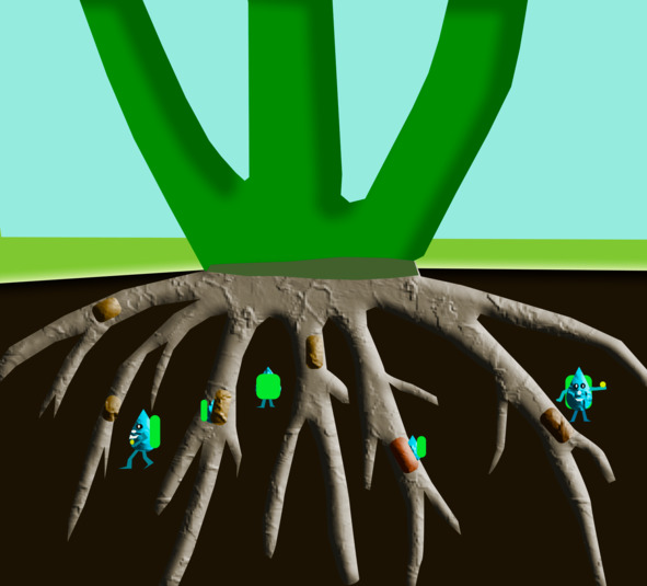 Далее, по маленьким норкам, которые проложили червячки и другие букашки, мы спустились под землю. Под землёй нам надо было собрать разные витаминки для цветочка: азот для роста, фосфор, калии и другие полезные элементы. Под землёй было темно и страшно. Пауки и гусеницы пугали нас. Но преодолев страх, мы набили наши рюкзачки витаминками и приблизились к корню. Через специальные дверки-волоски на корешке, мы пробрались внутрь корня. Далее нам предстояло подниматься вверх по стеблю. Подсаживая друг друга, мы добрались до листочков и цветочков, где и разгрузили наши рюкзачки.