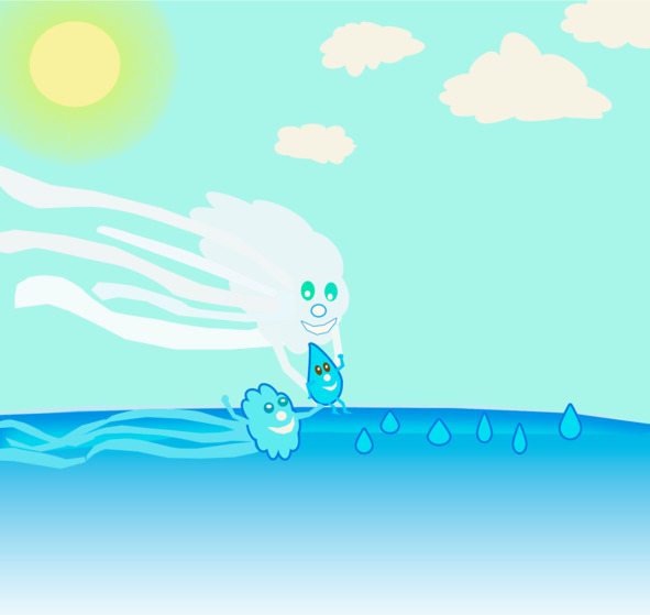 – Мой дом находится в далеком, тёплом океане. И вот однажды мне пришло сообщение, что этот самый цветочек нуждается в моей помощи. Попрощавшись с подружками и друзьями, я поднялась с глубины океана на его поверхность. Как следует, разогревшись солнечными лучиками, я разбежалась, что есть силы и выпрыгнула вверх, где меня подхватил тёплый морской ветерок и начал поднимать всё выше и выше. Поднявшись в небо с другими капельками, мы образовали облачко и полетели над землёй подгоняемые ветерком. Потом из облачка мы превратились в тучку. В тучке мы видели сверкающие и грохочущие разряды молний. Иногда начинали падать, думая, что никогда не долетим до цветочка. Но потоки тёплого воздуха поднимающегося от земли удерживали нас от падения. И вот, наконец, далеко внизу я увидела цветочек, махающий мне листиками. Обнявшись с несколькими капельками, мы превратились в одну тяжёлую каплю и спустились на землю.