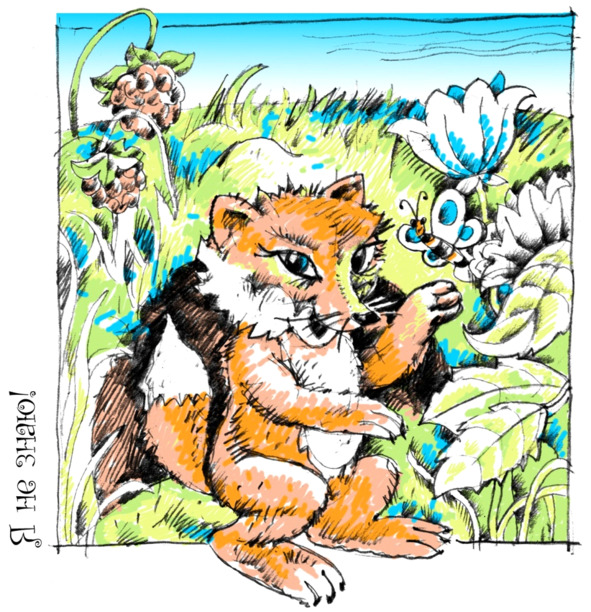 Жил на одной полянке маленький лисёнок. Лисёнок подрос, и пришло время вылезти ему из своей норки на свет. Норка находилась в овражке. Лисёнок с любопытством оглядел овражек. Зелёная травка, красные, синие и жёлтые лепестки цветов радовали взор. Внизу овражка бежал ручеёк, в котором весело резвились лягушата, ловя жужжащую над ними муху. Пчёлки трудились, собирая мёд, а недалеко от ручейка на камешке под лучами солнца нежилась ящерица.