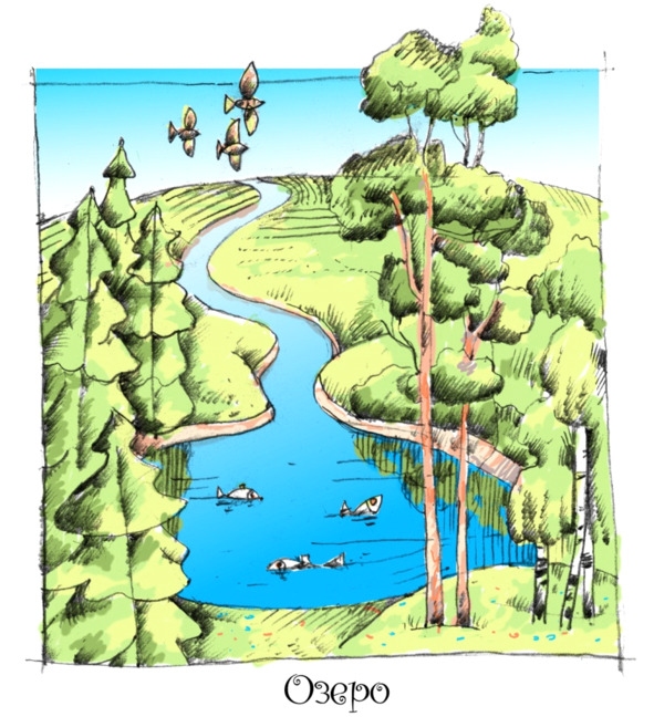 Лисёнок посмотрел вниз и увидел ещё больше. Его полянка была окружена елями, соснами и берёзами. Он увидел озеро, в которое впадает речушка. На глади озера красовались гуси, а ближе к зарослям камыша, крякая и ныряя, расположилась стая уточек.