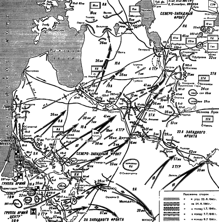 Ранним утром 22 июня немецкая артиллерия внезапно открыла огонь по пограничным заставам, пунктам управления, узлам связи, полевым и долговременным сооружениям в приграничной полосе. Одновременно авиация противника нанесла бомбовые удары по аэродромам, железнодорожным узлам, военно-морским базам, районам расположения войск, ряду городов Литвы и Латвии. Как сообщалось в разведывательной сводке штаба Северо-Западного фронта на 12.00 22 июня: «В 4.42 22 июня 1941 г. до 45 самолетов бомбили Шауляй… В 4.15 группа самолетов действовала над Виндавой; в 4.18 – 5 самолетов обстреляли Виштынец и эти же самолеты действовали над Кальварией; в 4.25 – на Юрбург сброшены бомбы; в 4.20 – до полка авиации бомбило Каунас, Кальварию; в 4.55 – 5 самолетов бомбили аэродром Паневежис. В этот же период времени были подвергнуты бомбардировке Кейданы, Симно, Алитус. В период с 9.08 до 9.12 12 Ю-88 пролетели на Шауляй и 9 бомбардировщиков с направления Россиены также на Шауляй. В 8.20 с высоты 3000 м бомбили Ораны и в 9.25 бомбили аэродром Шауляй»[52].