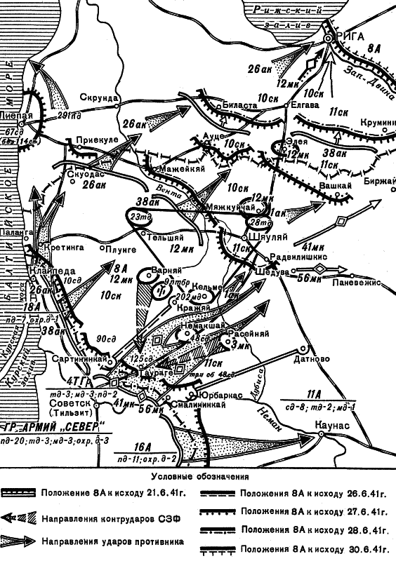 Главный удар в полосе 8-й армии противник нанес силами 4-й танковой группы и правофланговых соединений 18-й армии на шауляйском направлении против 90, 125-й и находившихся на границе трех батальонов 48-й стрелковой дивизии 11-го стрелкового корпуса. Вот что писал о начале боевых действий его командир генерал-майор М.С. Шумилов: «Война началась в 4.00 22.6.41 г. … Мной немедленно было доложено командующему 8-й армией, который находился на своем командном пункте в лесу западнее Шауляя. Получил приказ: «Огня не открывать! На провокацию не поддаваться!» Но войска без приказа открыли ответный огонь»[61].