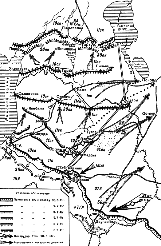 28 и 29.6.41 г. продолжайте отход, закончите 30.6.41 г., выведите все войсковые соединения. Ободрите войска. Сохраните их боеспособность и ждите в Риге. На главном маршруте следования организуйте крепкую противовоздушную оборону, для чего в ваше подчинение поступает 6-я смешанная авиационная дивизия, аэродром – в Риге.