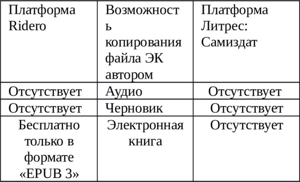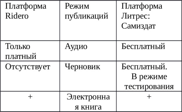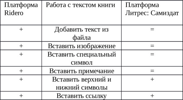 Возможности этих платформ по работе с авторскими книгами я показываю в следующих таблицах: