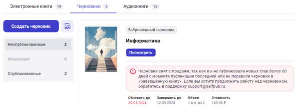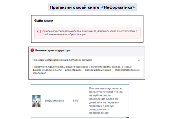«Черновик» – это такой режим работы, при котором у автора книги одни обязанности и сроки их выполнения (со штрафными санкциями – очевидно, сказывается пагубное влияние запада). А со стороны платформы – сплошные ограничения, вызванные недостатками системы редактирования и конвертации. Козлом отпущения здесь становятся почему-то авторы (см. рис.2).