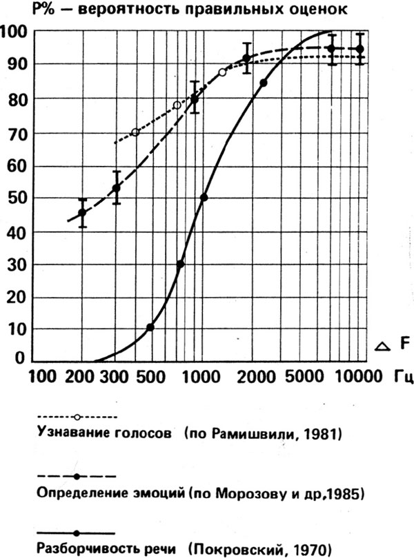 График показывает, что ограничение высоких частот до 400 Гц почти полностью разрушает лингвистическую информацию (разборчивость слов падает до 5,5 %), определение же эмоций в таком сигнале, так же как и узнавание диктора, в значительной степени сохраняются, 60 % и 70 % соответственно (Морозов и др., Язык эмоций, мозг и компьютер, 1989).