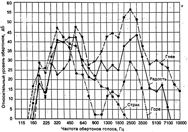 Наряду с этим установлено, что важнейшим средством психоакустического кодирования невербальной информации является спектр звука, определяющий, как известно, тембр голоса. Интегральный спектр голоса и речи с различным эмоциональным содержанием существенно различаются, особенно в высокочастотных областях спектра (см. рисунок 5). Так, для гнева характерно усиление высоких обертонов, что приводит к увеличению звонкости, «металличности» тембра, а для страха, наоборот, сильное падение высоких обертонов, что делает голос глухим, «тусклым», «сдавленным». Радость приводит к смещению формантных частот в более высокочастотную область, в результате того что человек говорит как бы «на улыбке» (см. рисунок 5 – спектр голоса Ф. Шаляпина при выражении разных эмоций).