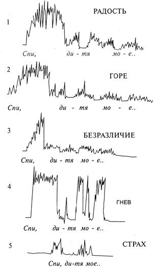 Рис. 6. Осциллограммы голоса, т. е. графическое изображение динамики звука во времени, показывают, что каждая эмоциональная интонация – радость, горе, безразличие, гнев, страх – выражается своими особыми, характерными для нее акустическими средствами (Морозов, 1989)