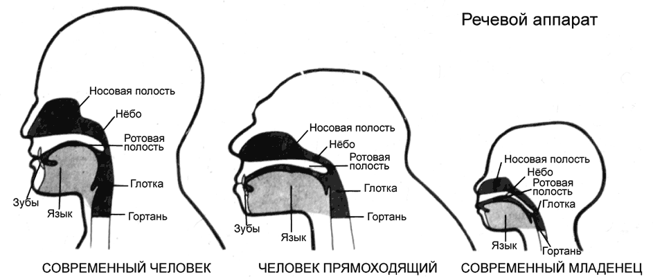 Рис. 2. К проблеме эволюции и онтогенеза голосового аппарата человека (по: Блум, Лейзерсон, Хофстедтер, 1998)