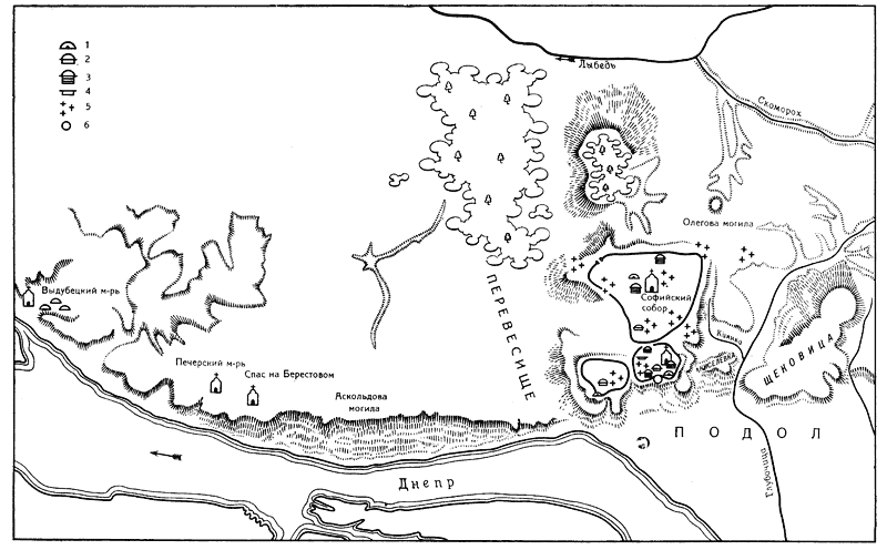 Киев и его окрестности в X–XIII вв. План составлен Л. А. Голубевой: 1 – курганные погребения с трупосожжением IX–X вв.; 2 – курганные погребения с трупосожжением в грунтовой могиле IX–X вв.; 3 – погребения в срубных гробницах IX–X вв.; 4 – погребения в грунтовых могилах конца X – начала XI в.; 5 – церковные кладбища XI–XII вв.; 6 – братские могилы XIII в.