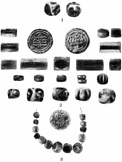 Погребальный инвентарь IX–X вв. Обнаружен в погребениях рядовых жителей Киева. Раскопки в усадьбе Десятинной церкви 1913 г. Киев. 1 – две пастовые бусы с инкрустациями; 2 – сердоликовые, пастовые и стеклянные бусы из ожерелья и подвеска-диргем; 3 – пастовые и стеклянные бусы из ожерелья.