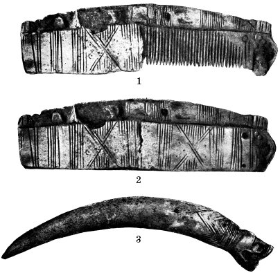 Погребальный инвентарь (IX–X вв.) рядового горожанина. Обнаружен в усадьбе Десятинной церкви. Раскопки 1913 г. Киев. 1,2 – костяной гребень в футляре; 3 – костяное острие.