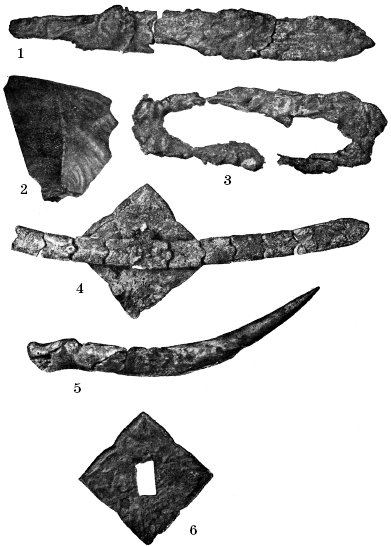 Погребальный инвентарь, обнаружен в погребении IX–X вв. рядового горожанина в усадьбе Десятинной церкви. Раскопки 1913 г. Киев. 1 – железный нож; 2, 3 – кремень и кресало; 4 – кожаный ремешок с бронзовыми бляшками; 5– костяное острие; 6 – бронзовая ромбовидная бляха.