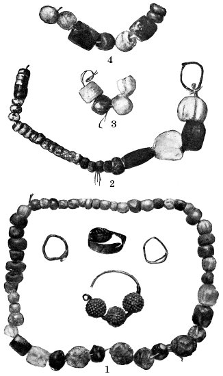 Погребальный инвентарь из погребений рядовых горожан IX–X вв. Обнаружен в усадьбе Десятинной церкви в 1913 г. Киев. 1– стеклянные, сердоликовые, хрустальные, янтарные и серебряные с зернью бусы, два серебряных височных кольца, трехбусинная серьга, пластичный серебряный перстень; 2 – стеклянные, сердоликовая, хрустальная и пастовая бусы; 3 – стеклянные бусы; 4 – стеклянные и сердоликовые бусы.